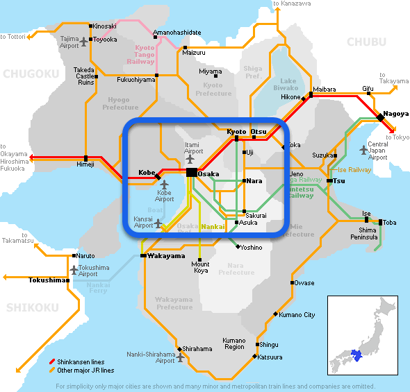 Karta över Kansai och inom den blå rutan ligger fyra intressanta städer. Klicka kartan.