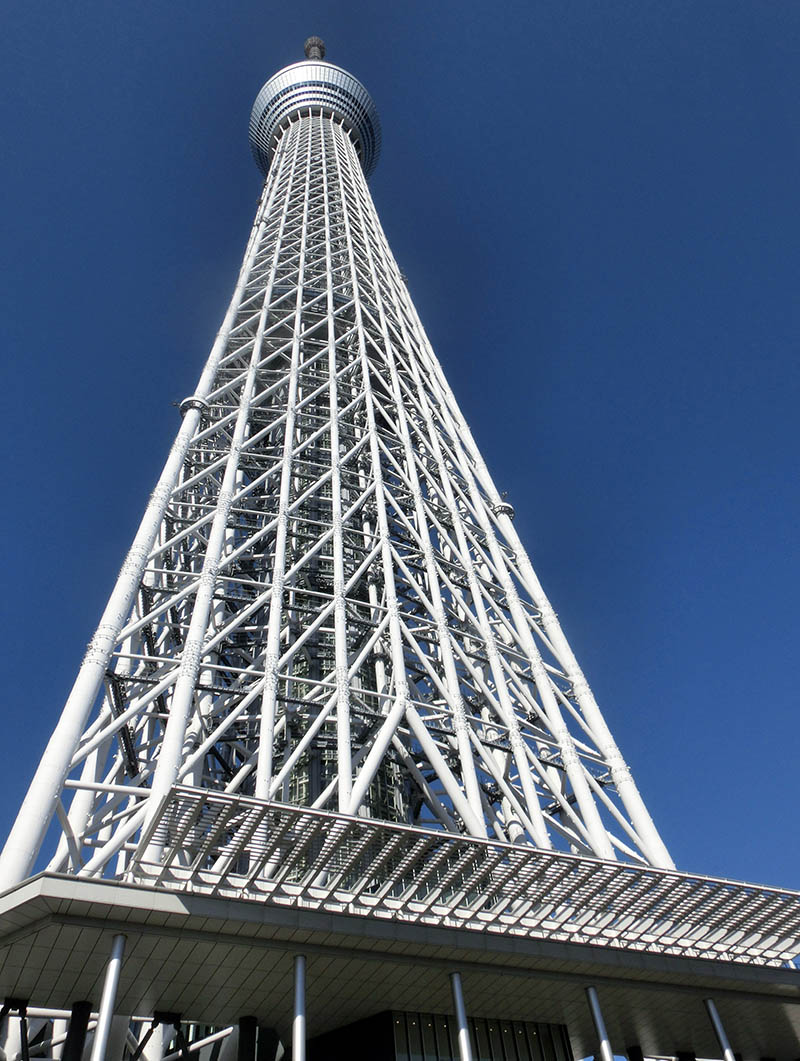 Skytree står som en mäktig raket mitt i Tokyo och utsikten från tornet över staden är storslagen. Tornet är 643 meter högt. Hissen däremot stannar på 350 och 450 meter.