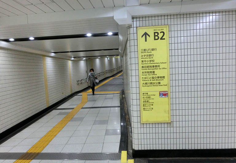 Utgång från tunnelbanan i Tokyo nära Skytree och Tobak- och saltmuseet.